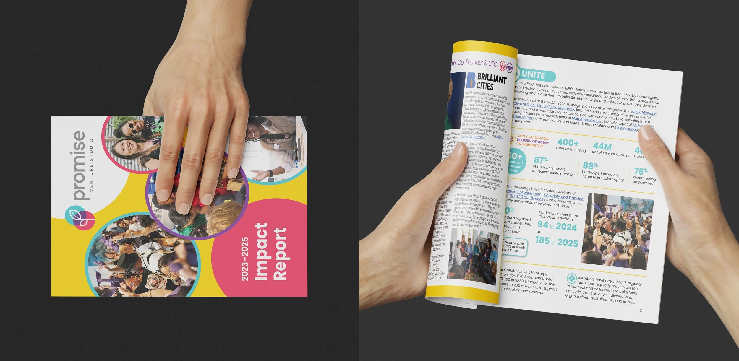 Videos and QR codes were incorporated to extend storytelling beyond the page and allow readers to engage more deeply with Promise’s leaders and ventures.